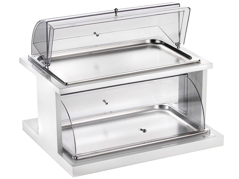 Compuesto por: 2 bandeja con asas GN 1/1 h 20 mm, 2 campanas rectangulares abatibles de policarbonato, 1 estructura de 2 pisos en MDF lacada en blanco.
