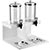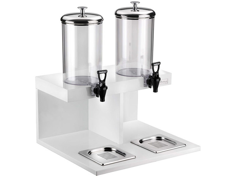 Compuesto por: 2 dispensadores para zumos de diámetro 16 cm y 4,5 Litros de capacidad, 2 cubetas GN 1/6 h 20 mm, 2 rejillas GN 1/6, 2 tapas para dispensador de zumos, 2 grifos desmontables de PPL Tomlinson, 2 pernos de cierre, 2 tubos refrigerantes de 5 cm de diámetro y 27,5 cm de longitud, 2 anillos para tubo refrigerante, 1 estructura en MDF lacado blanco para dispensador doble de zumo. Medidas 51 x 46 x altura 60 cm.