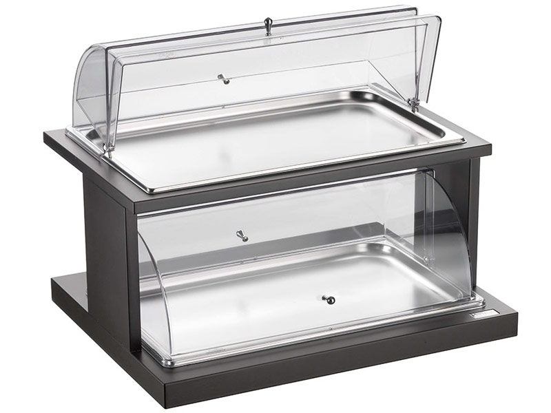 Compuesto por: 2 bandejas con asas GN 1/1 h 20 mm, 2 fuentes GN 1/1 h 40 mm, 2 doble fondo perforado policarbonato GN 1/1, 4 packs de gel refrigerante 20 x 19 cm, 2 campanas rectangulares abatibles de policarbonato, 1 estructura de dos pisos MDF acabado Wengué.