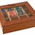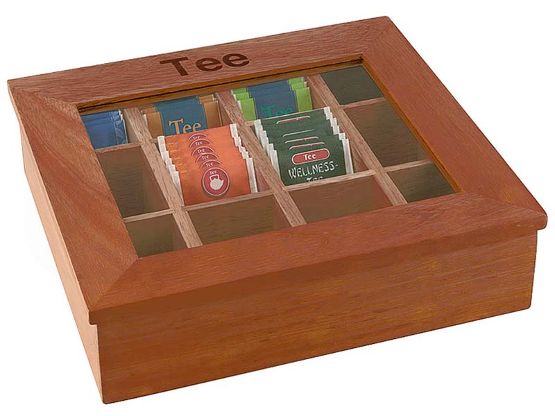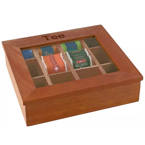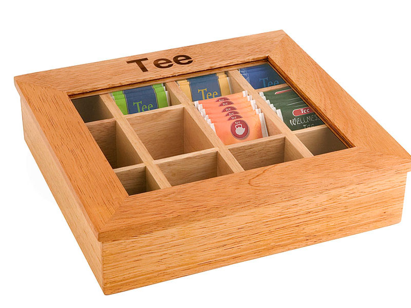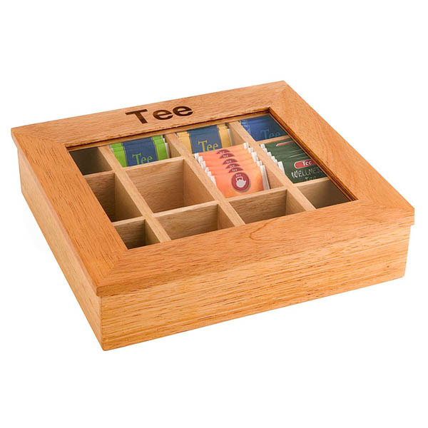 Cajas de madera (clara u oscura) con ventana transparente. Rectangular. Capacidad 120 bolsitas.