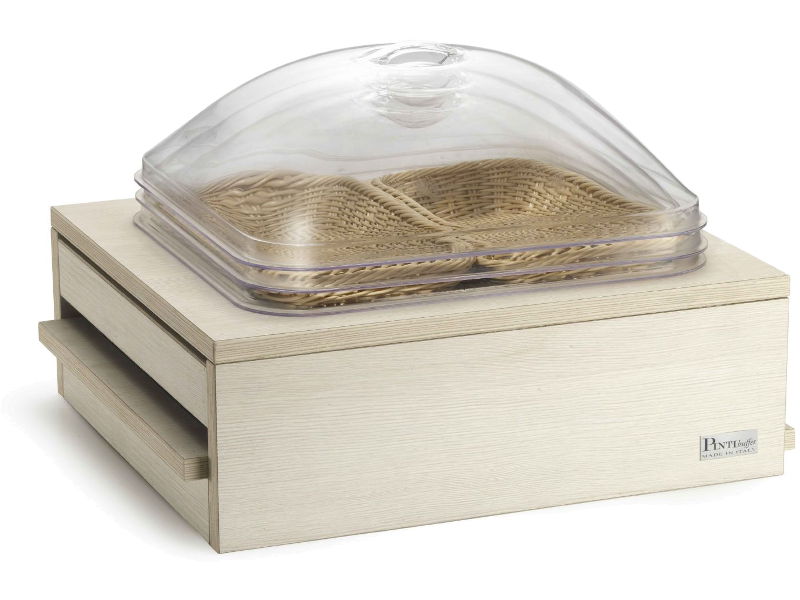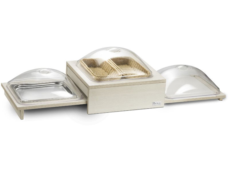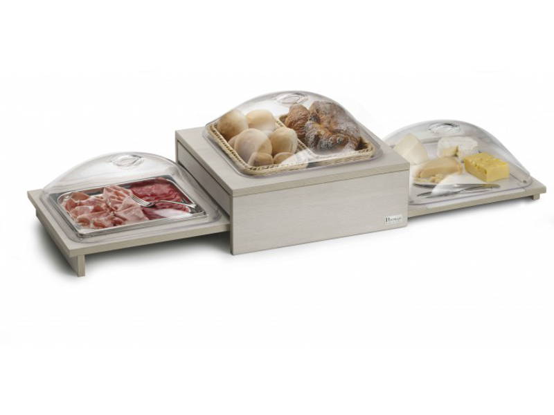 Para salami y embutidos, panes, quesos... . Compuesto por un soporte de madera revestida resistente a arañazos y golpes, dos cestas de pan GN 1/3 (h50mm), tres campanas cuadradas (PET), una bandeja GN 1/2 (h20mm), una bandeja GN 1/2 (h40mm) y un gel pack refrigerante (20x19cm). Incluye tabla de polietileno.