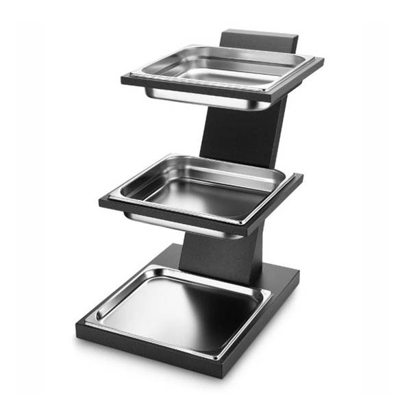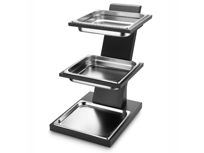 Expositor 3 niveles Cubic. Compuesto por soporte en madera DM lacada en negro y 3 cubetas GN 2/3 (↑ 20mm).