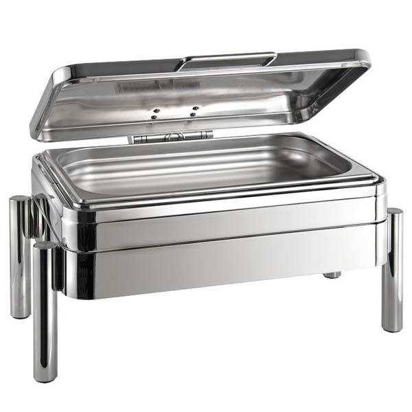 Chafing Dish GN 1/1. Compuesto por pie soporte, baño maría con base sandwich, marco, tapa hidráulica, cubeta GN 1/1 (h65mm).