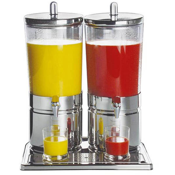 Dispensador doble zumo Inox:. base Inox pulido brillante, con dos acumuladores de frío (1 en la tapa y otro en la base). Acero Inox 18/8 y contenedor de SAN.