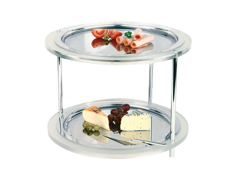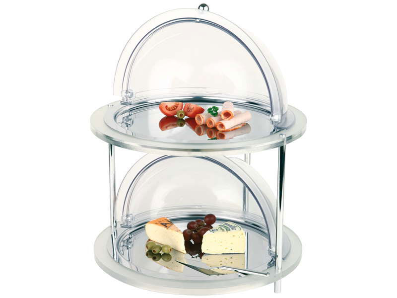 2 bandejas Ø38cm y 2 cubetas Inox 18/10, 4 enfriadores y 2 marcos acrílico con 3 patas cromadas. Campanas roll-top no incluidas.