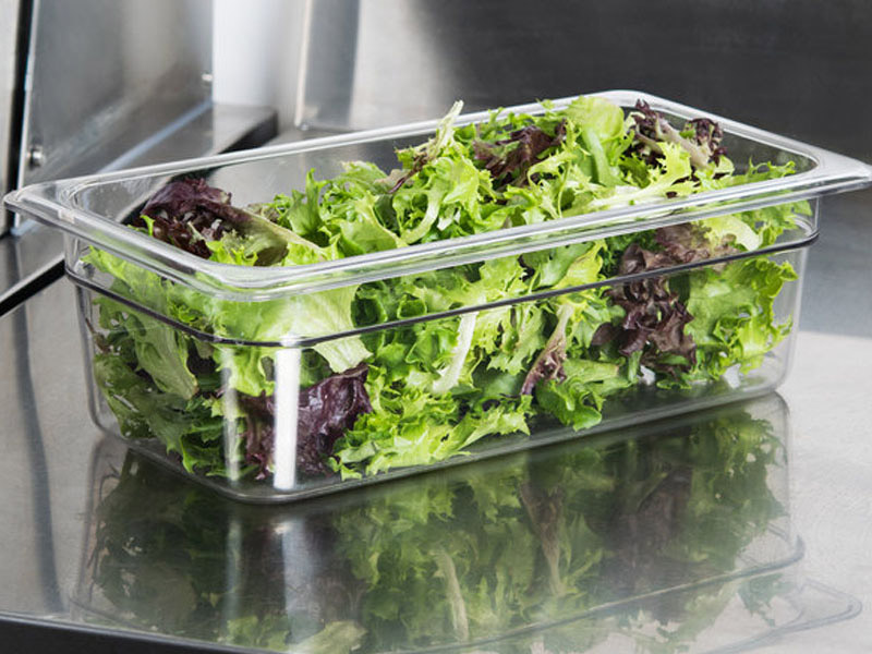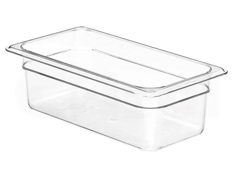 Cubetas Gastronorm Camwear de policarbonato transparentes. Almacene, transporte y sirva toda clase de alimentos en un material prácticamente irrompible. Excelente para su uso en estaciones de preparación y bufés.