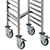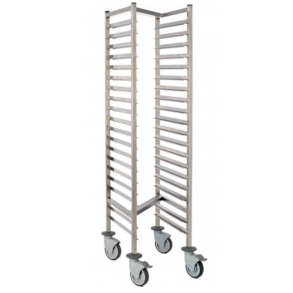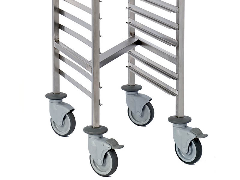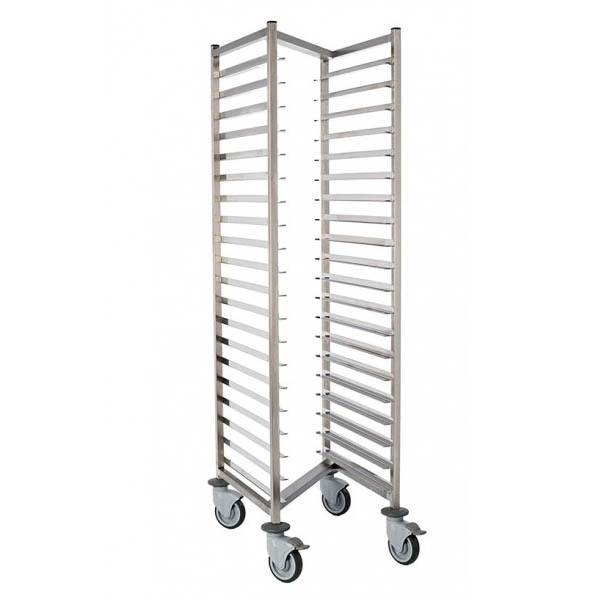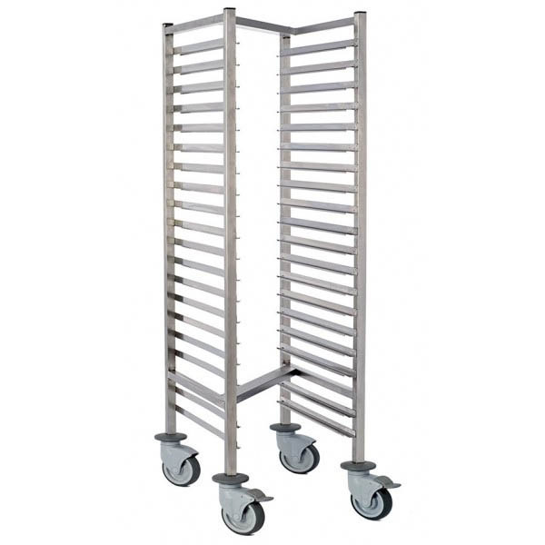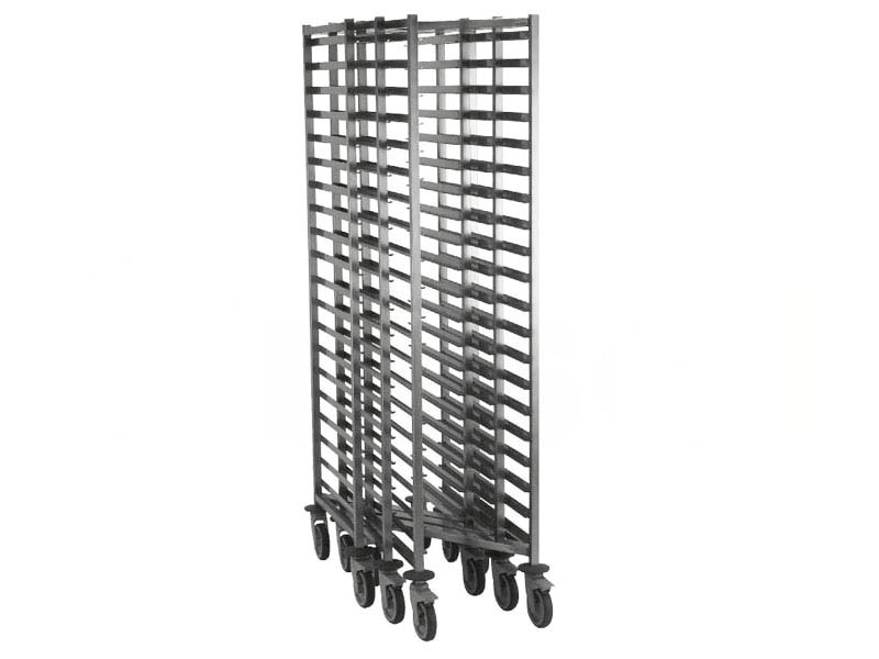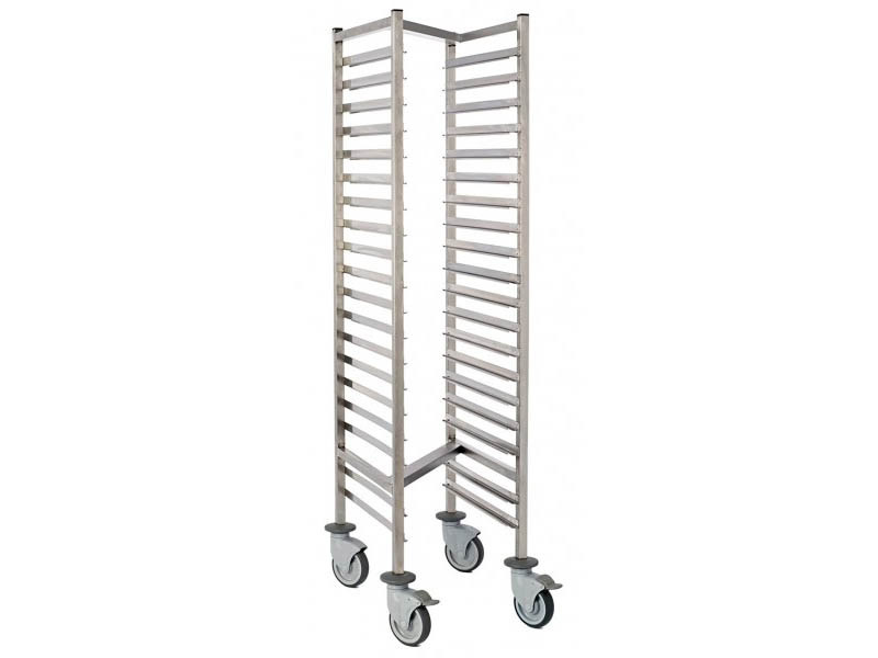 15 pares de rieles dobles para el transporte de hasta 30 bandejas o 15 cubetas GN 1/1 (apertura por el lado estrecho). Distancia entre las bandejas de 75 mm. 2 ruedas giratorias con frenos. Carga máxima de 100kg.