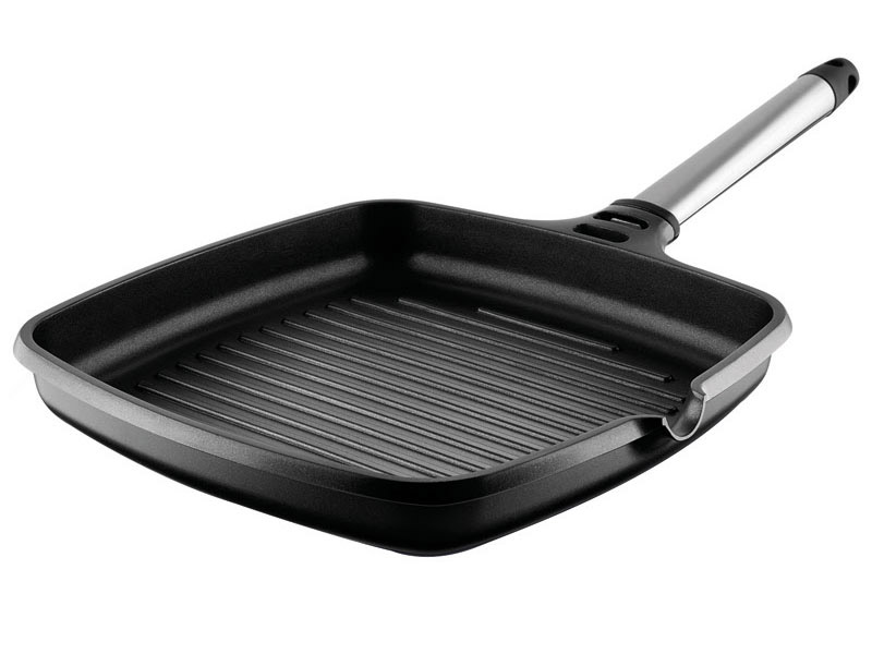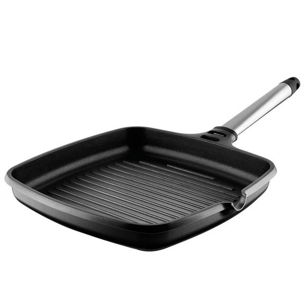 Asador grill Induction. Aluminio fundido de gran espesor. Distribución homogénea del calor. Indeformable. Mango en acero inoxidable desmontable. Ideal para cocinar sin grasas. Resistente al horno hasta 250ºC (sin el mango).