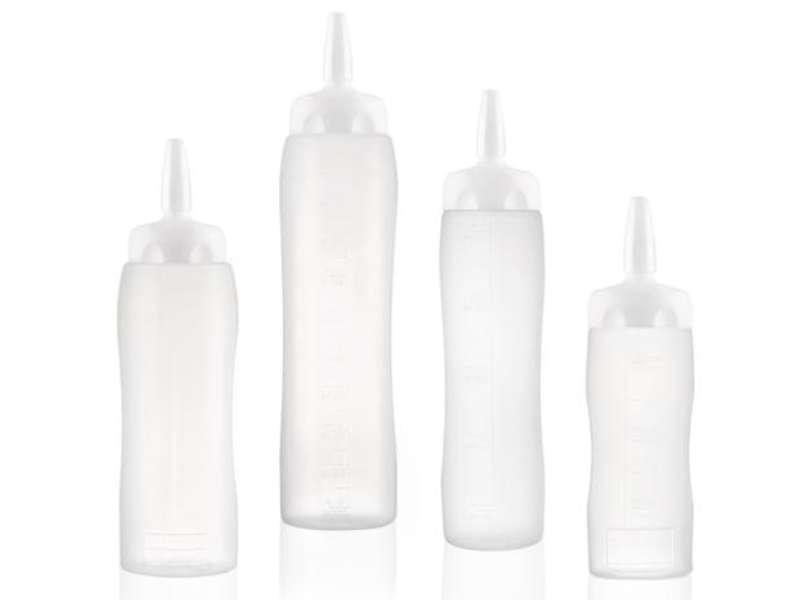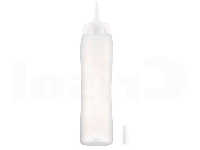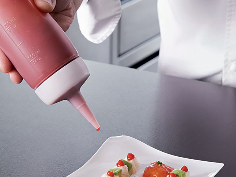 Dosificador de salsa. Se usa para introducir todo tipo de aderezos, más ligeros o más espesos, aceites, salsas, reducciones, jarabes? Permiten decorar un plato de forma limpia, aliñar con la cantidad justa una ensalada o cualquier otra elaboración y disponer de una amplia variedad de aderezos conservados con toda seguridad.