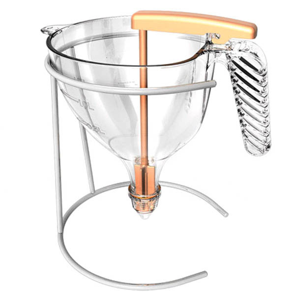 Embudo de 1,5L. Ø20 cm, altura 34 cm. Mango ergonómico de plástico con 3 boquillas (2, 4 y 6mm). Incluido pie de alambre y bandeja recogegotas.