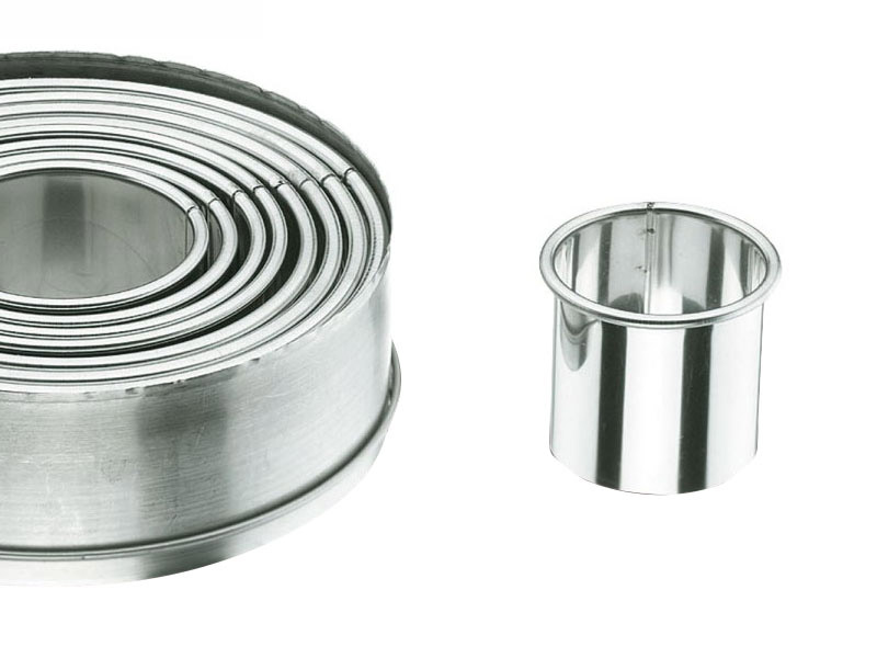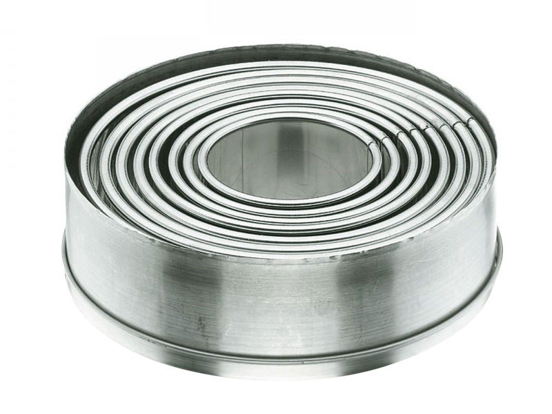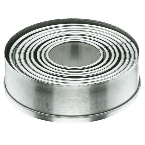 Set cortapastas de acero inoxidable 18/10. Caja con 9 cortapastas de Ø4, Ø5, Ø6, Ø7, Ø8, Ø9, Ø10, Ø11 y Ø12 cm.