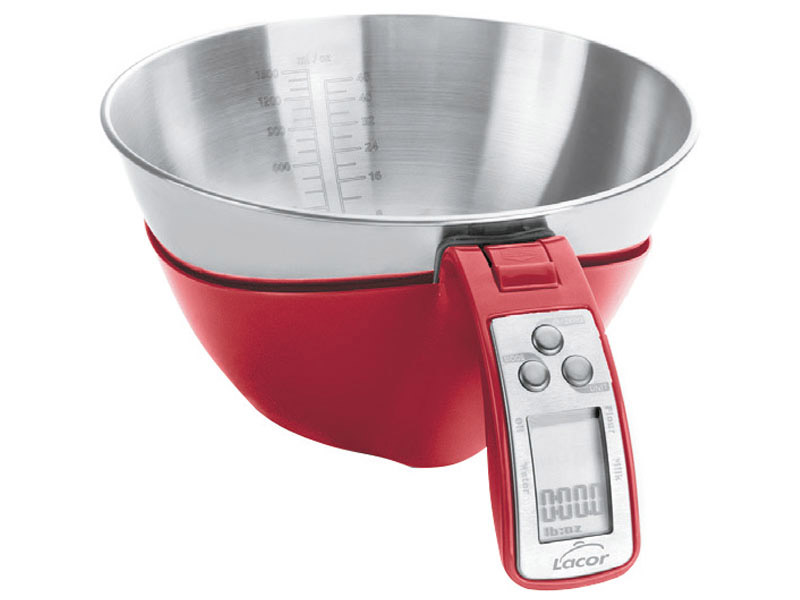 Báscula digital con bol extraíble y marcas de llenado. Bol de acero inoxidable Ø21 cm y 1,5 Litros. Escala de 1 g a 5 Kg. Apertura y cierre deslizante. Display digital y 3 botones.