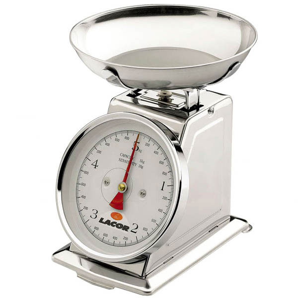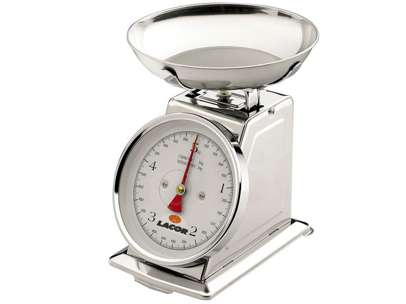 Báscula mecánica de acero inoxidable 18/10 de diseño retro. Calibración manual. Uso doméstico. Permite pesar alimentos de forma cómoda y sencilla. No necesita pilas.