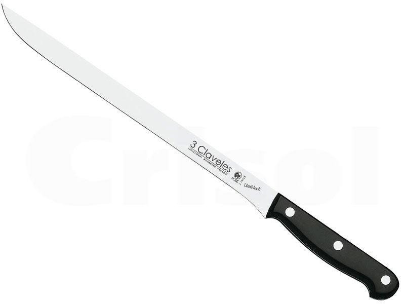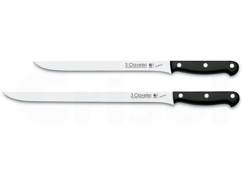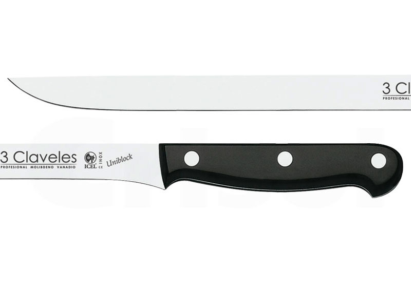 Mango plástico y hoja de acero inoxidable. Disponible en tamaños de 21,5 y 24 cm.