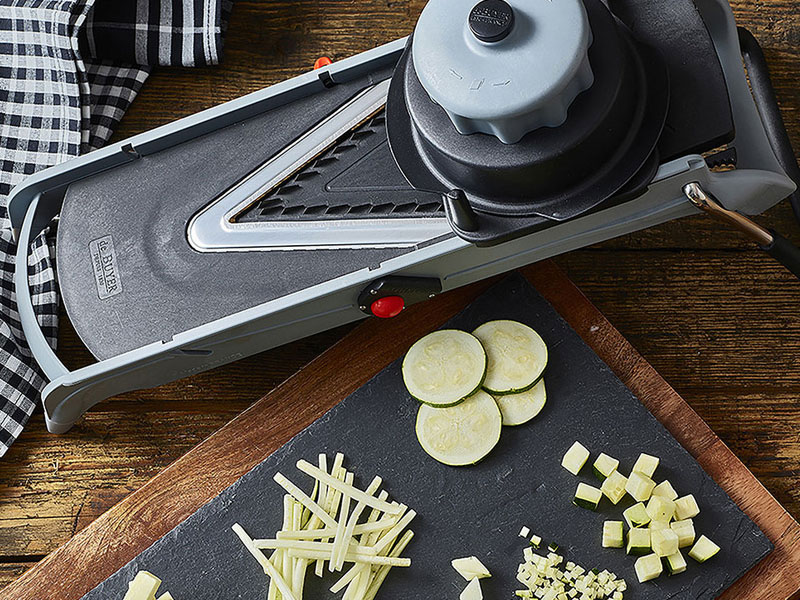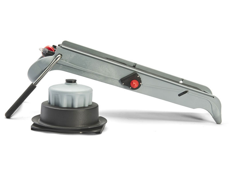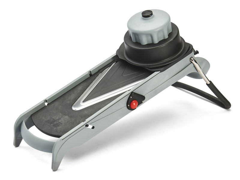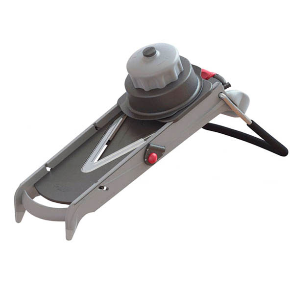 Mandolina Viper. Ultracompacta y profesional, fabricada en acero inoxidable. Para cortar frutas, verduras e incluso embutidos de forma fácil y segura. El diseño de sus cuchillas en forma de V garantiza un corte limpio y precisos. Grosor de rodajas regulable de 1 a 8 mm. Incluye cuchilla juliana 4 y 10 mm. Carro empujador con control de rotación.