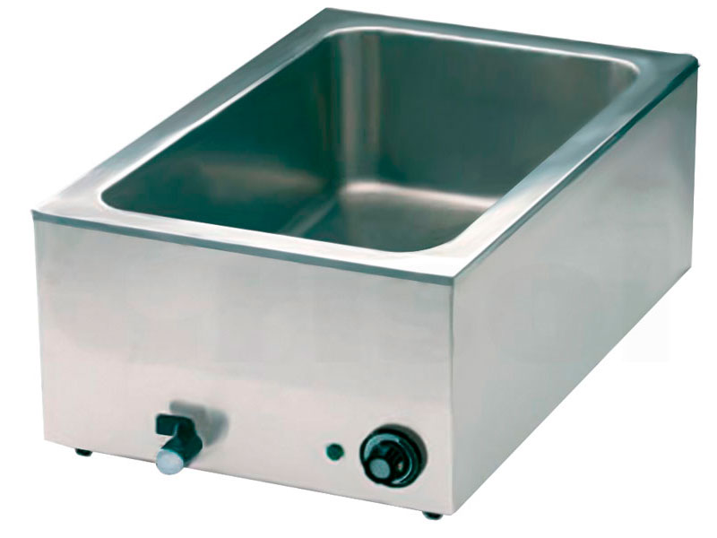 Cuba GN 1/1 con válvula de vaciado. Panel de control con indicador luminoso y termóstato ajustable de 0 a 110°C. Potencia 1.200 W.