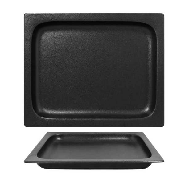 Fuente 1,3 L - GN 1/2 - 325 x 265 x h20 mm. Disponible en 6 colores dentro de la colección NEOFUSIÓN. Inspirado en materiales minerales.Cada pieza posee la solidez de la porcelana y la apariencia de la cerámica gracias a un esmalte ultraresistente y no poroso pulverizado a mano.