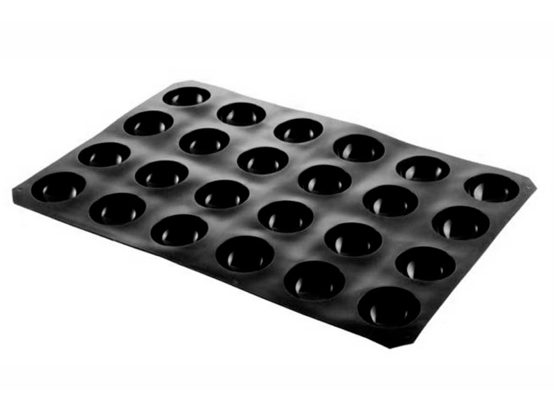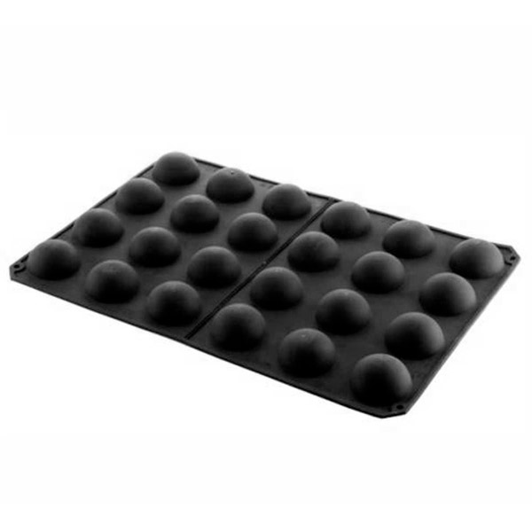 Molde de silicona diseñado para elaborar 24 pasteles semiesféricos. El molde, con una altura de 3,5 cm, mide de 60 x 40 cm y puede dividirse en 2 moldes de 30 x 20 cm gracias a su diseño simétrico. Ideal para congelador, horno y lavavajillas.