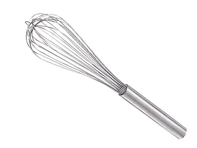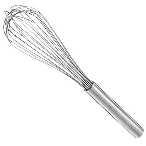 Batidor de acero inoxidable con 12 varillas de 1,3 mm de grosor para mezclar líquidos y preparar salsas, de forma rápida y cómoda en la cocina profesional.