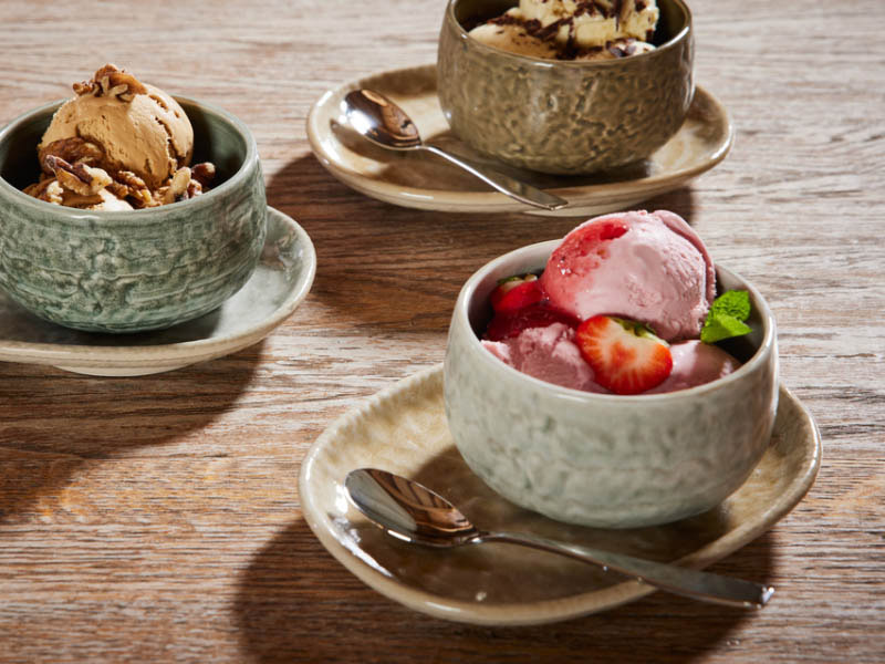 Inspirado en materiales minerales. Cada pieza posee la solidez de la porcelana y la apariencia de la cerámica gracias a un esmalte ultraresistente y no poroso pulverizado a mano.