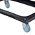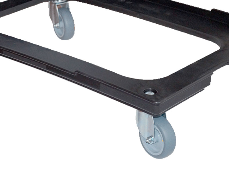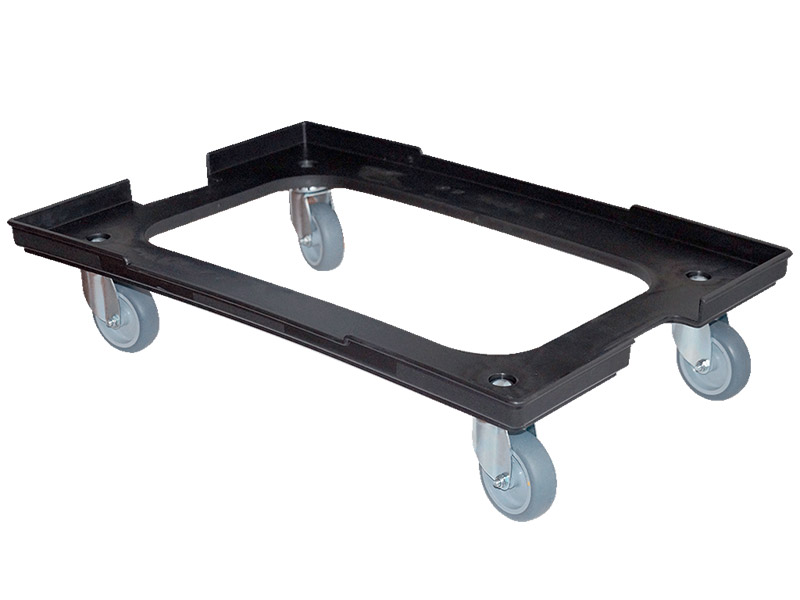 Carro portacajas abierto para el transporte de cajas Norma Europa. Plataforma de plástico resistente y dimensiones de 60 x 40 cm. Equipado con cuatro ruedas de caucho de 75 mm de diámetro, proporciona un movimiento suave y silencioso, además de ser completamente direccionables, lo que facilita la maniobra en espacios reducidos.