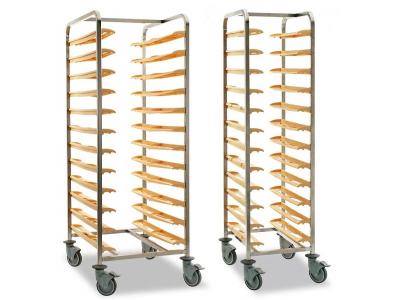 Carros para cafetería. Tubos de 25x25 cm de acero inoxidable y ruedas giratorias con frenos. Soportes de popipropileno con bloqueo para bandejas. Capacidad de 12 a 24 bandejas según modelo. Con paneles laterales o sin paneles. Espacio entre niveles de 10,8 cm. 5 kg de carga máxima por nivel. Altura de carro: 170 cm.