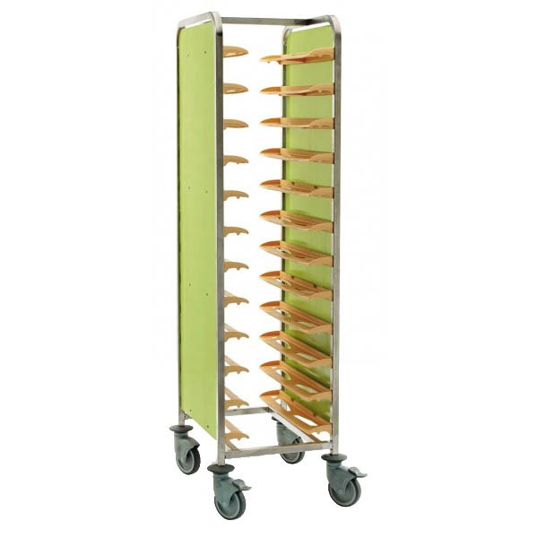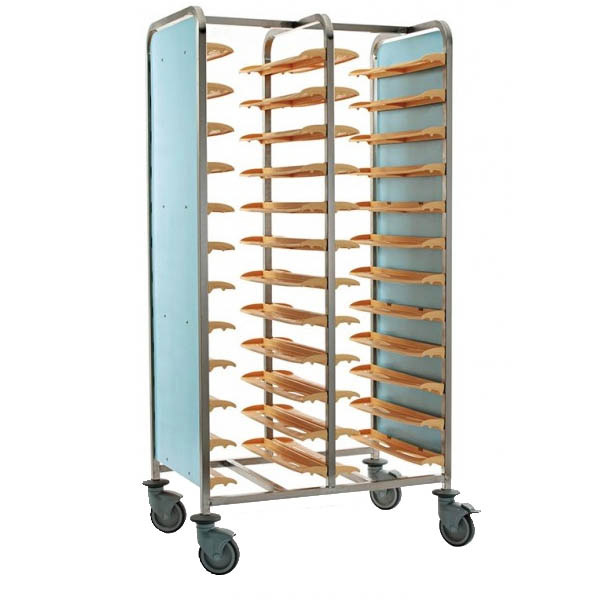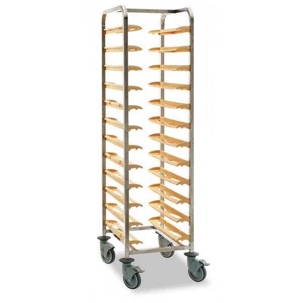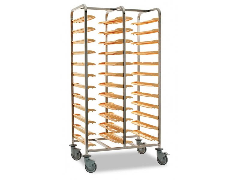 15 pares de rieles dobles para el transporte de hasta 30 bandejas o 15 cubetas GN 1/1 (apertura por el lado estrecho). Distancia entre las bandejas de 75 mm. 2 ruedas giratorias con frenos. Carga máxima de 100kg.