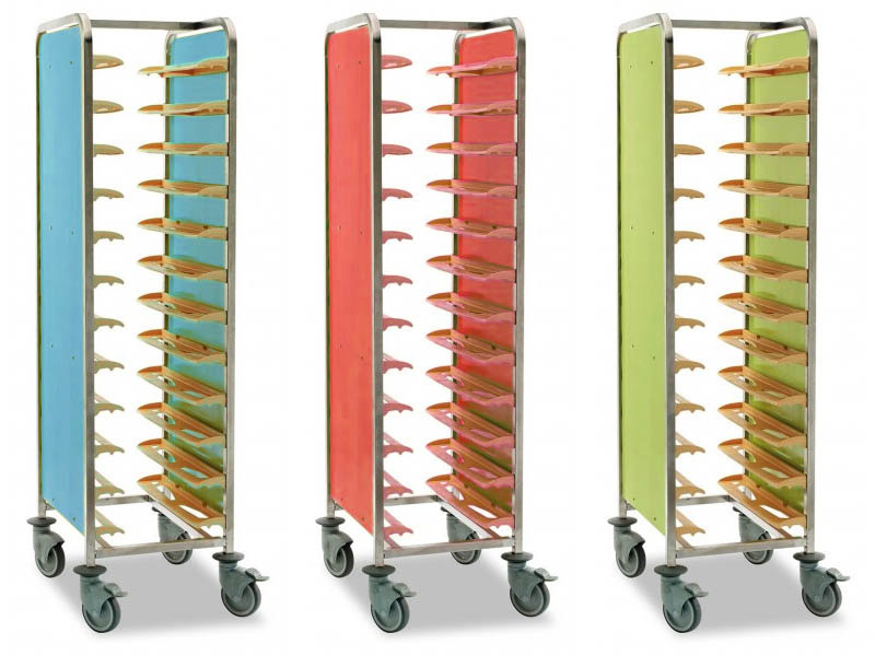 Acero inox de tubo cuadrado 25x25 soldado. Ruedas giratorias con frenos. Soportes de poliprop. con bloqueo integrado. Paneles laterales de poliestireno alimentario en 3 colores: azul, verde o rojo. Espacio entre niveles 108 mm.