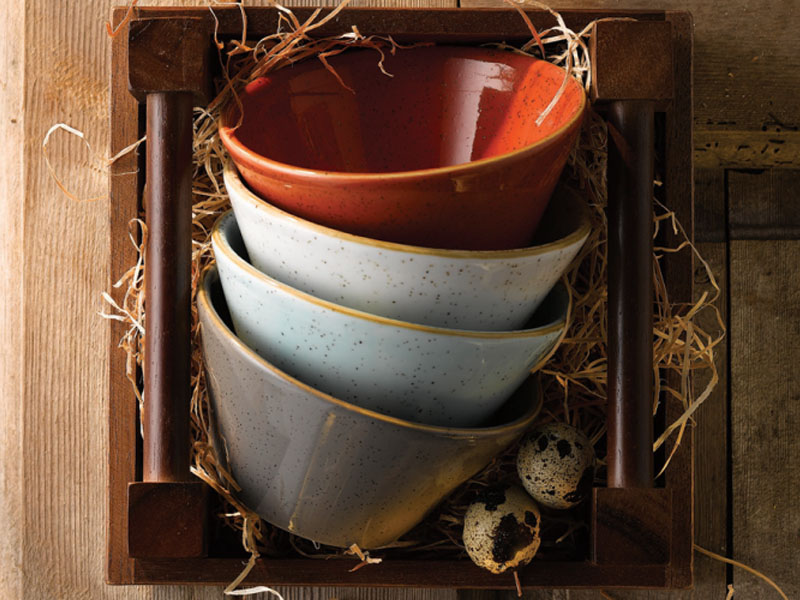Inspirado en materiales minerales. Cada pieza posee la solidez de la porcelana y la apariencia de la cerámica gracias a un esmalte ultraresistente y no poroso pulverizado a mano.