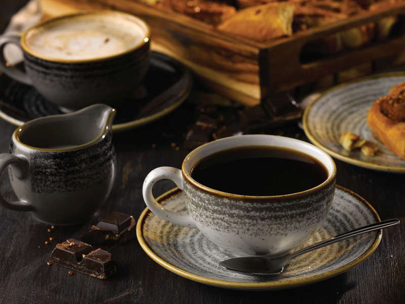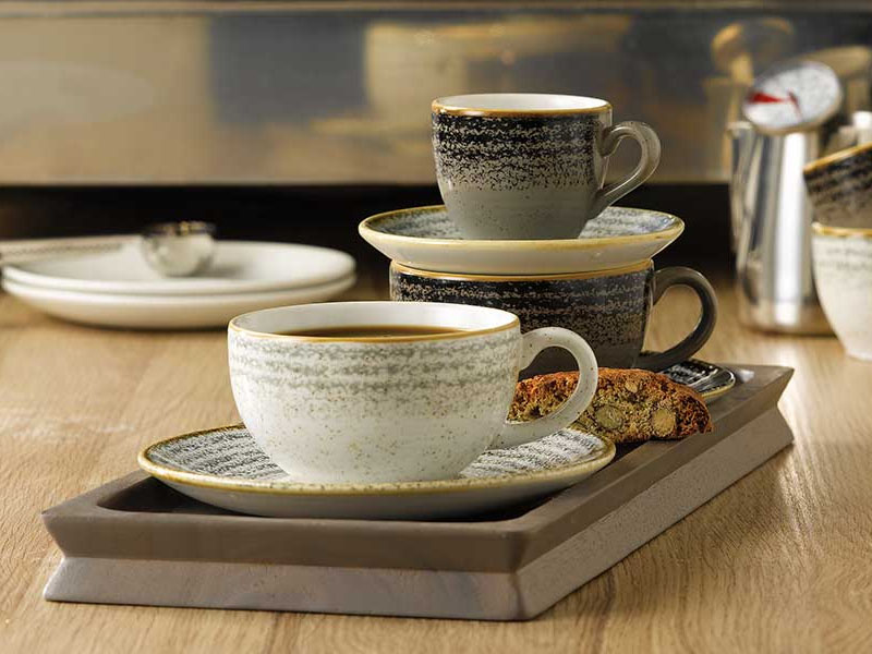 Inspirado en materiales minerales. Cada pieza posee la solidez de la porcelana y la apariencia de la cerámica gracias a un esmalte ultraresistente y no poroso pulverizado a mano.