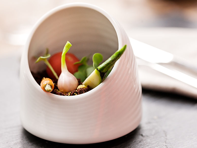 Inspirado en materiales minerales. Cada pieza posee la solidez de la porcelana y la apariencia de la cerámica gracias a un esmalte ultraresistente y no poroso pulverizado a mano.