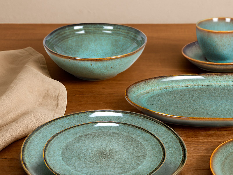 Opal Green forma parte de la línea StoneWare de gres porcelánico. Su distintivo esmalte en tonos verde ópalo, aplicado manualmente, confiere a cada pieza un carácter único y una belleza natural que recuerda a la piedra pulida por el tiempo. Moldeado por presión con arcilla refinada y esmaltado por inmersión interior y exterior, asegurando una cobertura homogénea. La base se limpia con precisión y se añade a mano una capa final que realza su acabado artesanal.