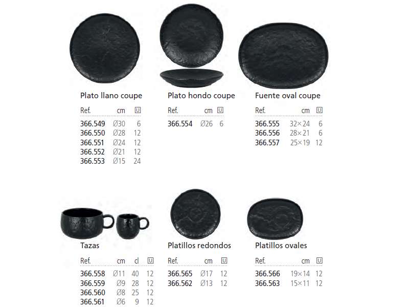 Platos llanos sin ala (forma NANO) de Ø 31, 29, 27, 24, 21, 18 y 15 cm. Disponible en 6 colores dentro de la colección NEOFUSIÓN. Inspirado en materiales minerales.