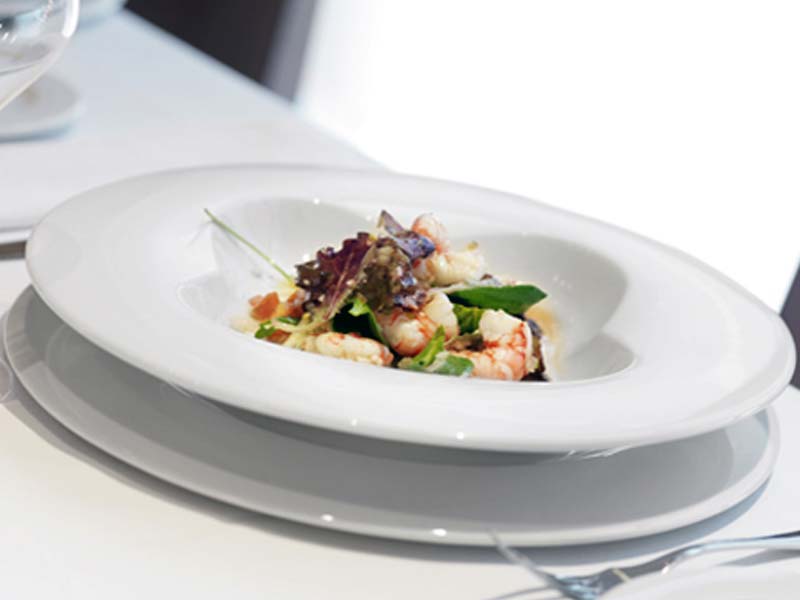 4 Innovadores platos de pasta de suave perfil y bordes anchos, apilables entre sí, y un plato de sopa cuadrado ideal para entrantes, postres o porciones más pequeñas.