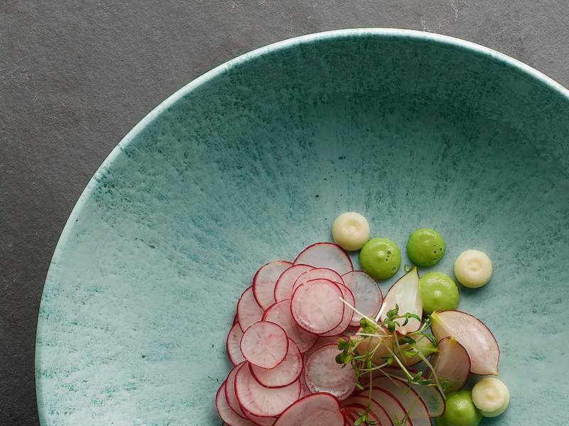 Cada pieza posee la solidez de la porcelana y la apariencia de la cerámica gracias a un esmalte ultraresistente y no poroso pulverizado a mano. Inspirado en materiales minerales.